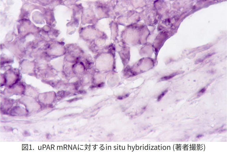 悪性腫瘍においてはセリンプロテアーゼのひとつであるウロキナーゼ型プラスミノゲンアクチベータ(uPA)や組織型プラスミノゲンアクチベータ(tPA)が発現し、uPAはプラスミノゲンを加水分解しプラスミンへと活性化させ、さらにはpro-collagenaseを活性化することによって、細胞外マトリックスを融解することにより悪性腫瘍の浸潤・転移に関与すると考えられている1).また、腫瘍間質部の線維芽細胞は、プラスミノゲンアクチベータインヒビター1(PAI-1)やPAI-2を分泌し、効率よくuPAと結合してその活性を阻害するものと考えられている2)3).PAI-1、PAI-2、uPAおよびuPA受容体(uPAR)は腫瘍浸潤部に多く局在し(図1)、腫瘍と間質の相互作用が示唆された4).uPAの強発現は予後不良因子と考えられる. uPARはVEGF(Vascular endothelial growth factor)を誘導して血管新生に関与し5,6)、インテグリンに影響して癌細胞の接着にも関係する7).PAI-1はuPA/uPARと細胞外マトリックスタンパク質との結合を修飾し、浸潤・増殖を促進する可能性も示されている。上皮間葉転換(epithelial-mesenchymal transition; EMT)においても、uPA/uPARは、Ras遺伝子を活性化する遺伝子を抑制することにより、EMTや幹細胞様の性質をもつ細胞を誘導するという報告がある8).急性前骨髄性白血病(APL)や一部の固形癌では血管内皮やマクロファージや腫瘍細胞の膜表面にアネキシンA2が存在し、tPAおよびプラスミンと結合してプラスミノゲンを活性化することによって、播種性血管内凝固症候群(DIC)を引き起こすといわれている9).